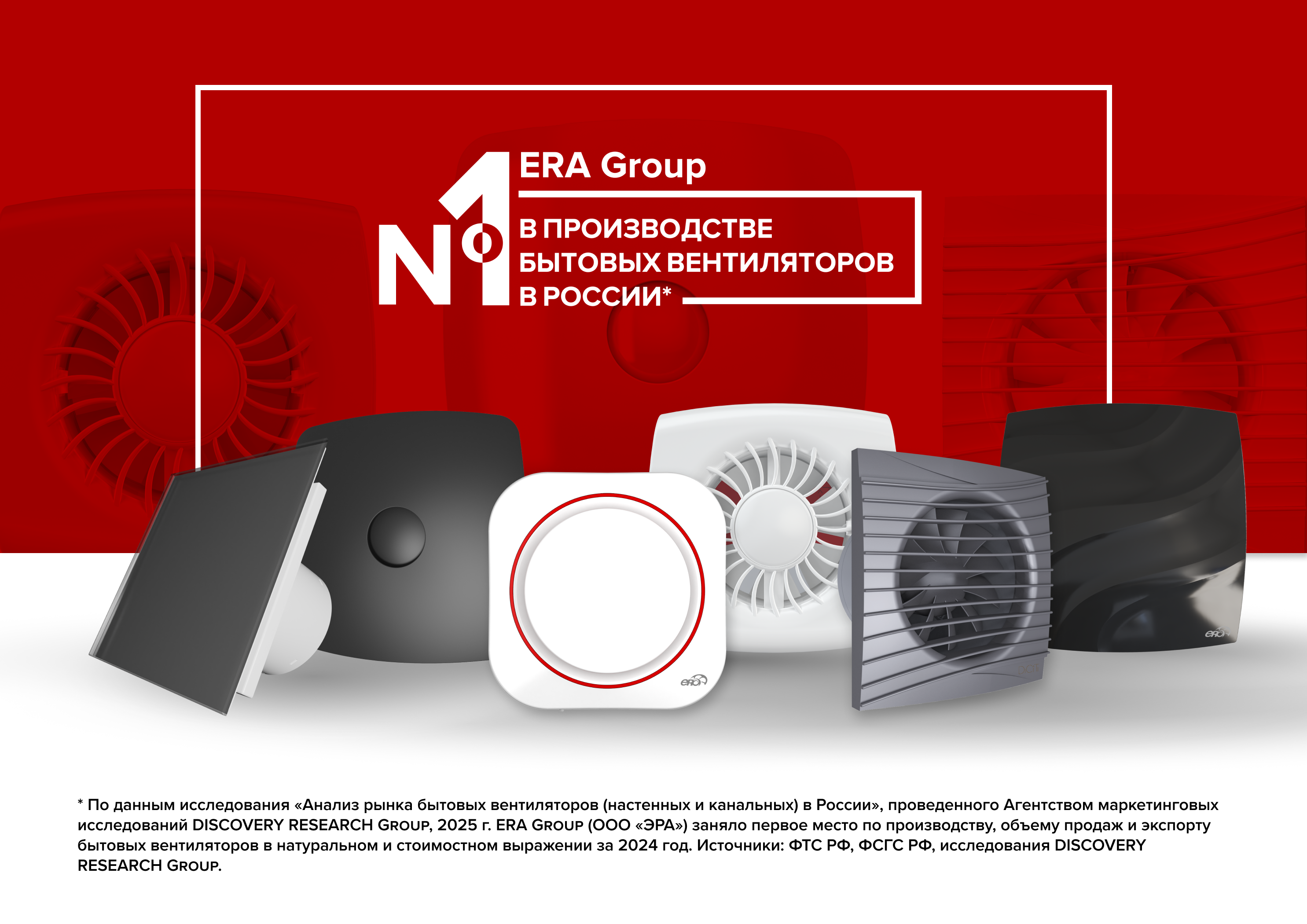 *По данным исследования «Анализ рынка бытовых вентиляторов (настенных и канальных) в России», проведенного Агентством маркетинговых исследований DISCOVERY RESEARCH Group, 2025 г. ERA Group (ООО «ЭРА») заняло первое место по производству, объему продаж и экспорту бытовых вентиляторов в натуральном и стоимостном выражении за 2024 год. Источники: ФТС РФ, ФСГС РФ, исследования DISCOVERY RESEARCH Group.