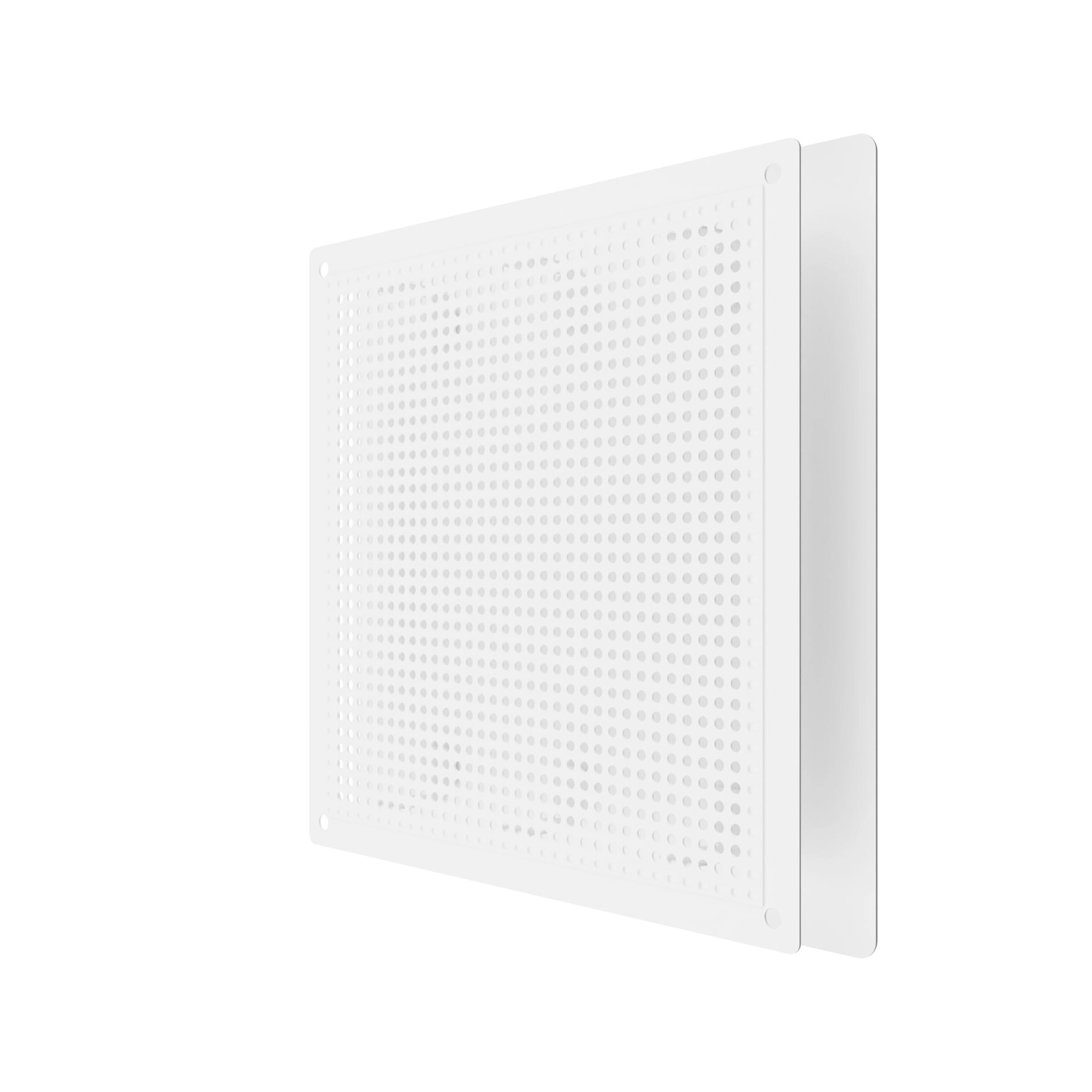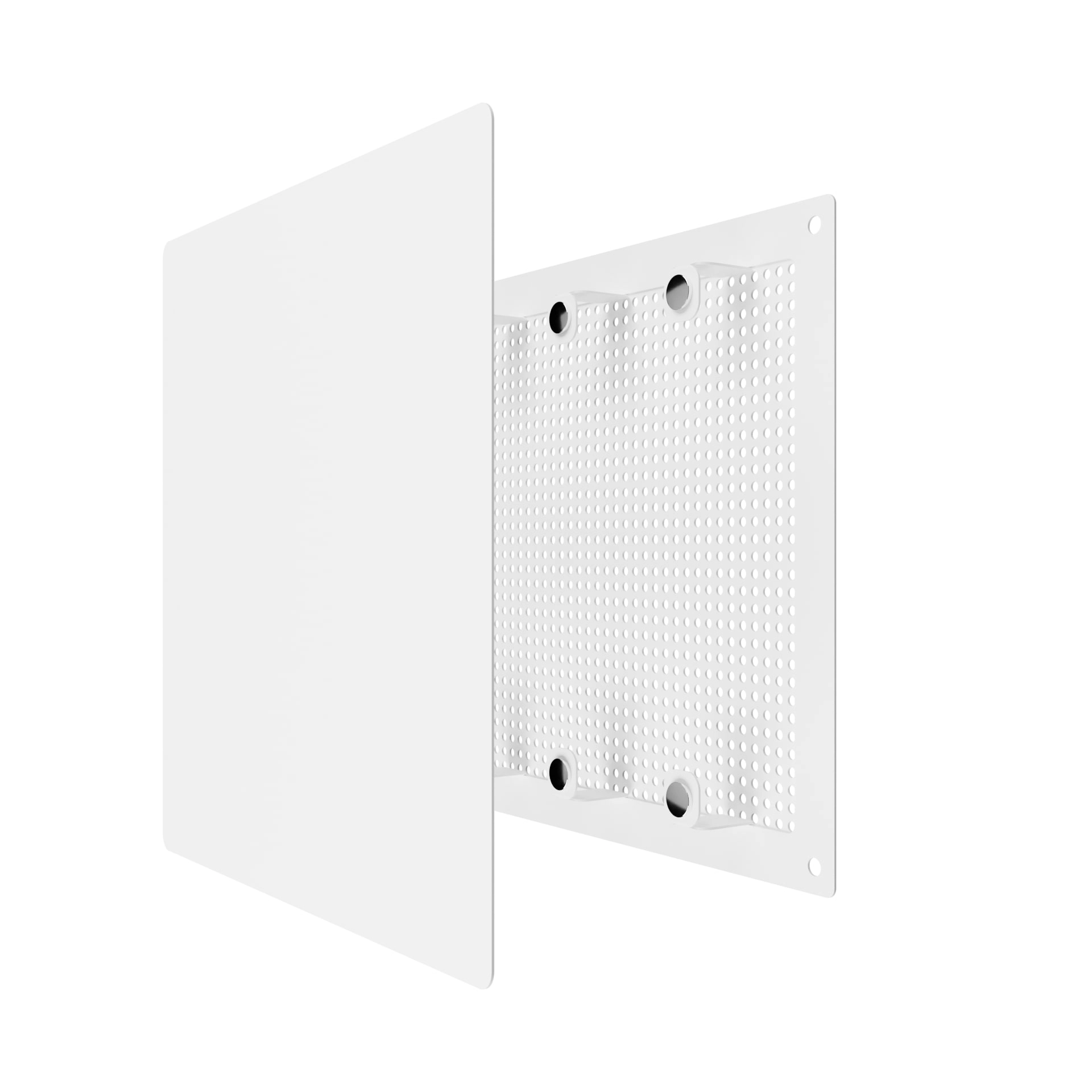 RVM состоит из двух частей. Рамка с сеткой и магнитами крепится к поверхности при помощи саморезов или клея, декоративная панель фиксируется на рамку с помощью магнитов, благодаря чему легко снимается для обслуживания решетки, скрывает вентиляционное отверстие и крепление рамки. За счет такой конструкции доступ воздуха в шахту не перекрывается и происходит его равномерное распределение.