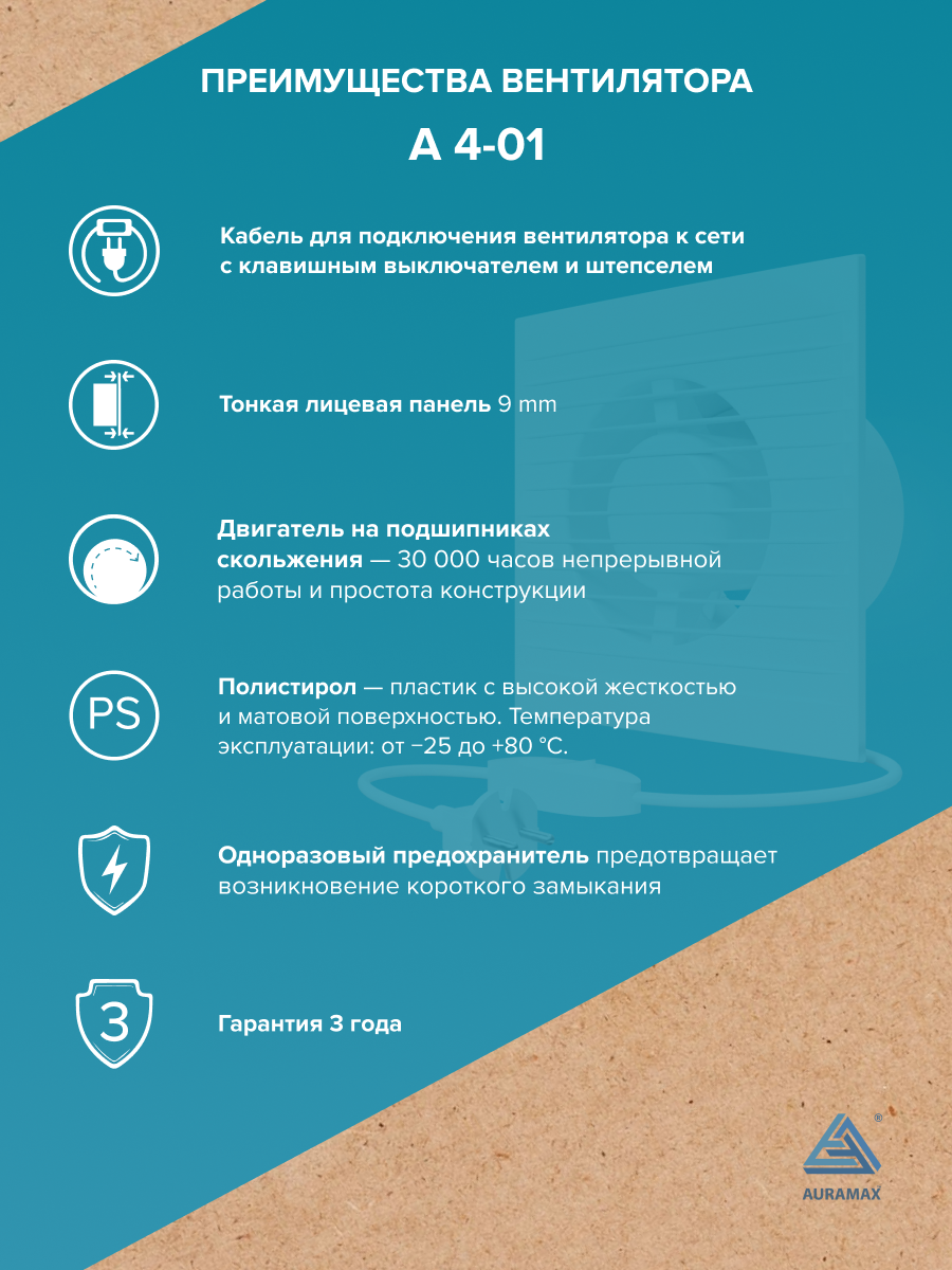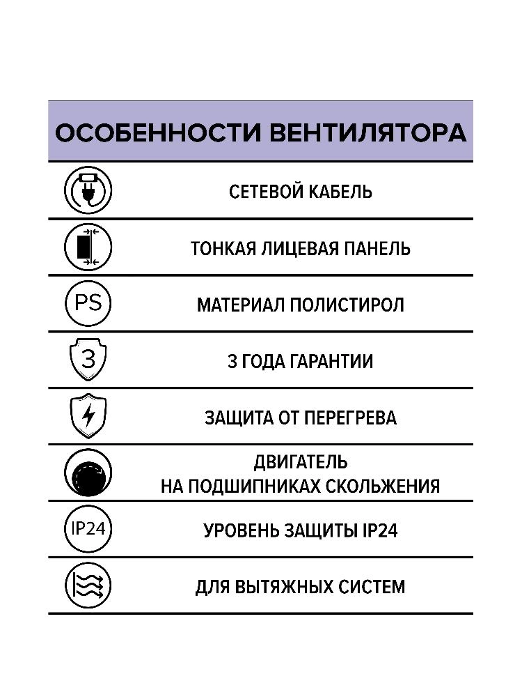 Двигатель на подшипниках скольжения отличается простотой конструкции и гарантирует вытяжку влажного и загрязненного воздуха. Предохранитель Termo fuse отключит вентилятор при нагреве обмотки свыше +130 °C.