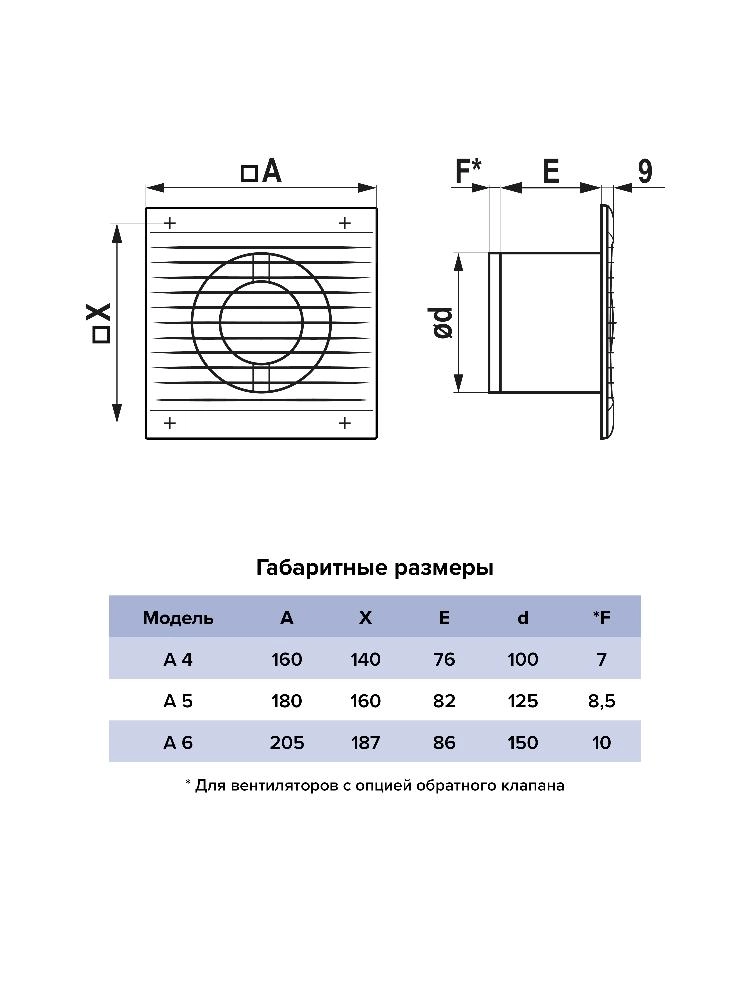 Предлагаем ознакомиться с обратными клапанами по ссылке. Пружинный механизм обратного клапана обеспечивает надежное перекрытие воздушного потока. Устанавливается при помощи специальных креплений, предусмотренных на выходном патрубке. Не подходит для монтажа в потолок. При настенном (вертикальном) монтаже вентилятора клапан должен свободно открываться. При потолочном (горизонтальном) обратный клапан необходимо демонтировать. Совместимость наших изделий с товарами других производителей не гарантируется.