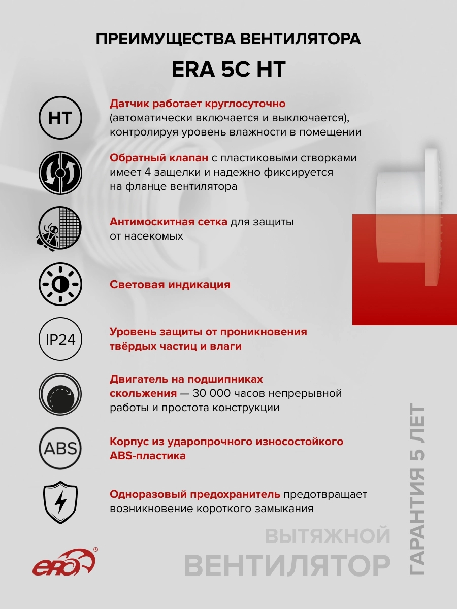 Вентилятор ERA 5С HT применяется для постоянной и периодической вентиляции санузлов, ванных комнат, кухонь и других бытовых помещений.