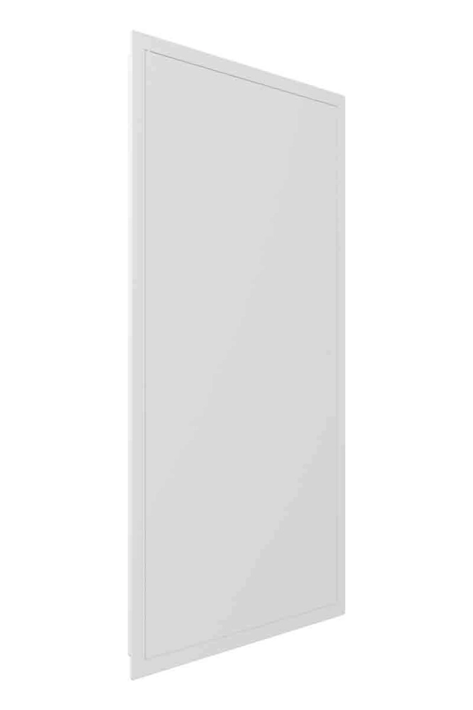 Смотрите карточку товара в разделе «Характеристики». Там указаны габариты рамки (Ш×В) — сколько закроет люк по стене или потолку.
