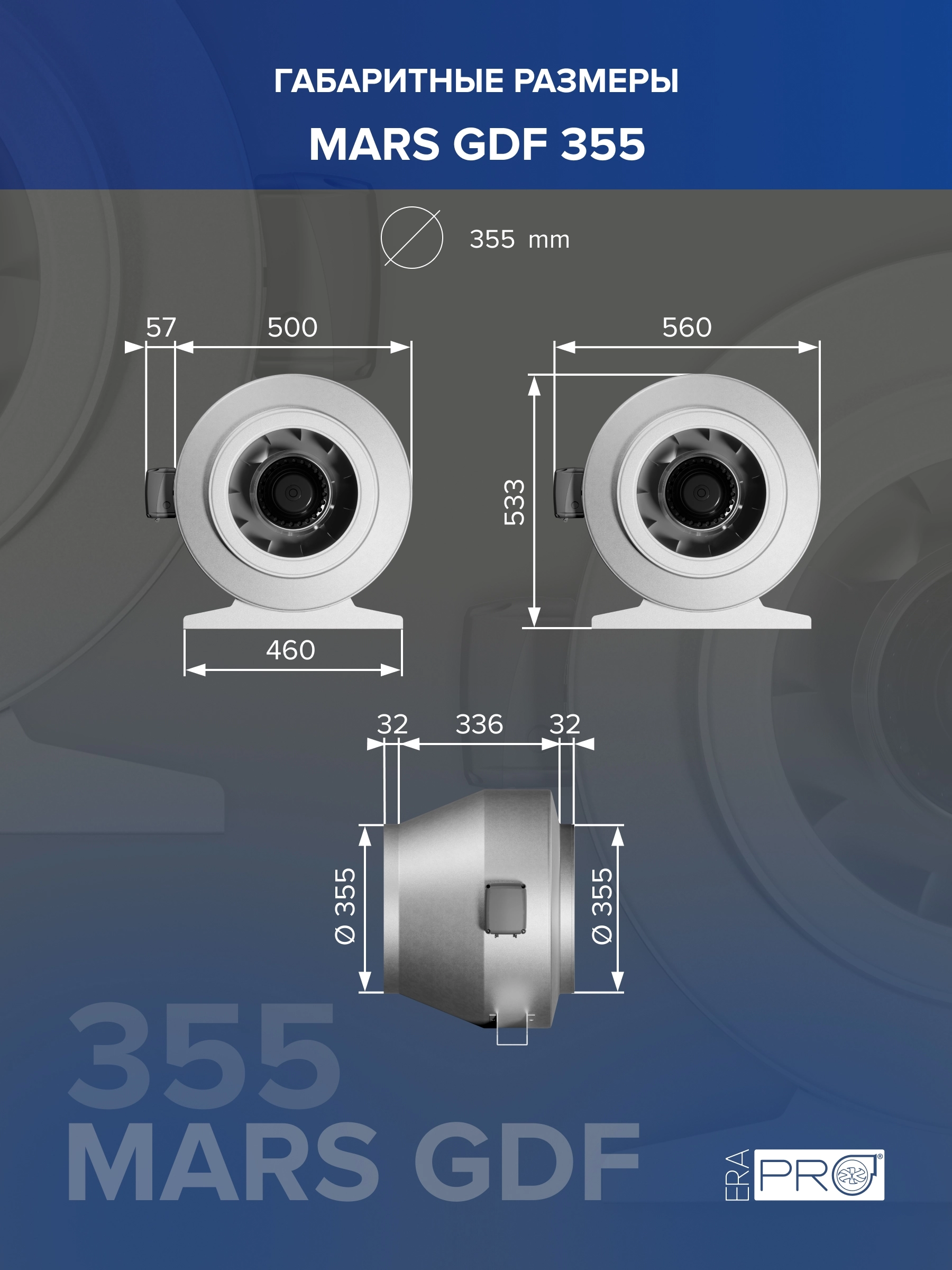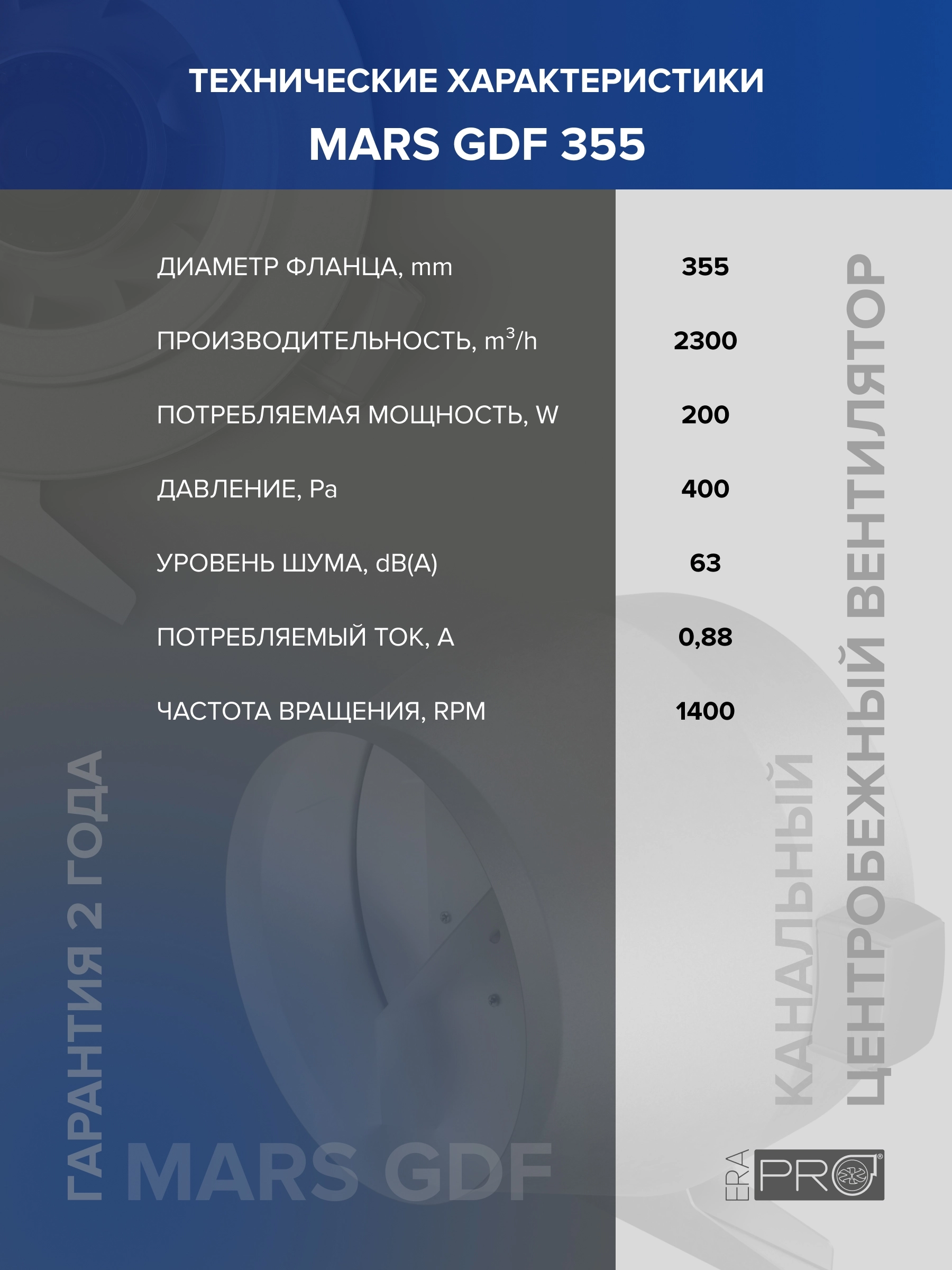 Канальный центробежный вентилятор MARS GDF 355 предназначен для установки под любым углом в любой точке вентиляционных систем промышленных, общественных и жилых зданий. Центробежные вентиляторы применяются в системах с разветвленной сетью воздуховодов, где необходимо высокое давление.