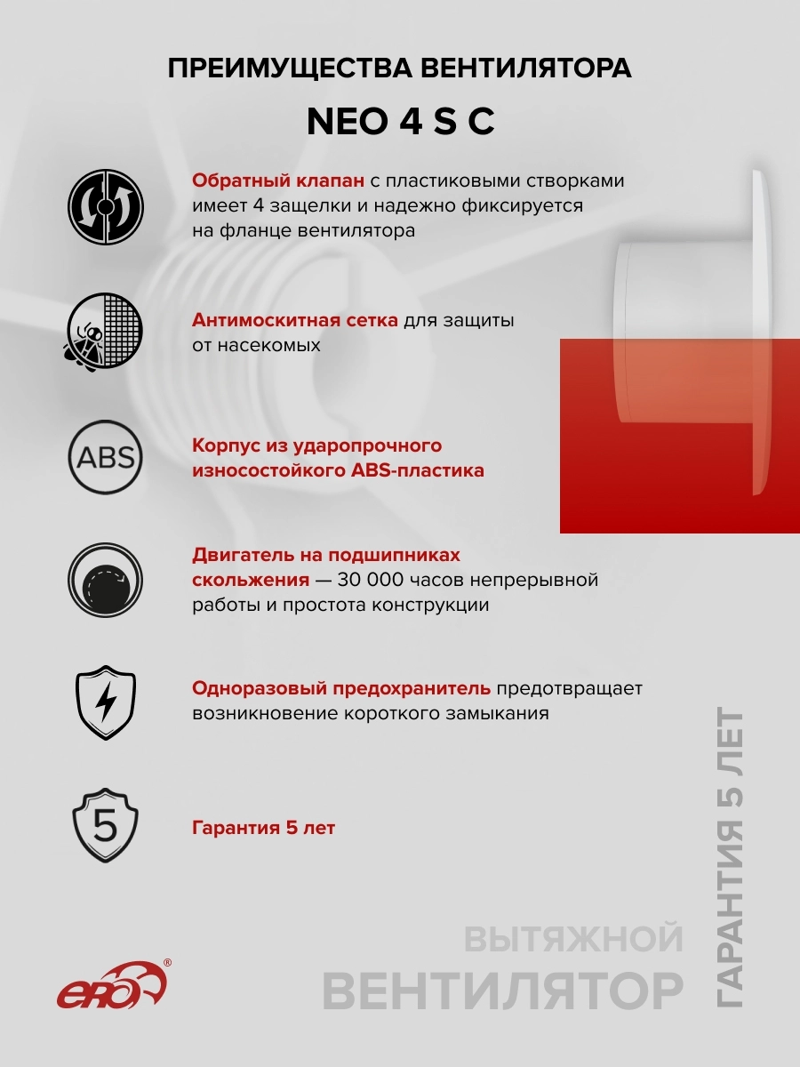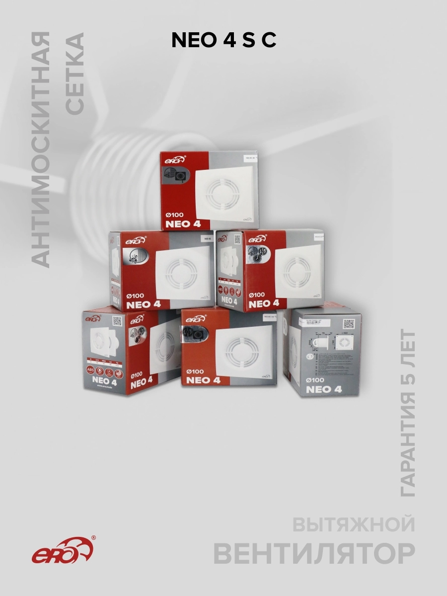 Хорошая вытяжка — один из главных критериев комфорта для ванной, туалета и кухни. Дышать дома чистым воздухом поможет вытяжной вентилятор NEO 4 S С. Он гармонично вписывается в любой интерьер благодаря тонкой лицевой панели с радиальными жалюзи.