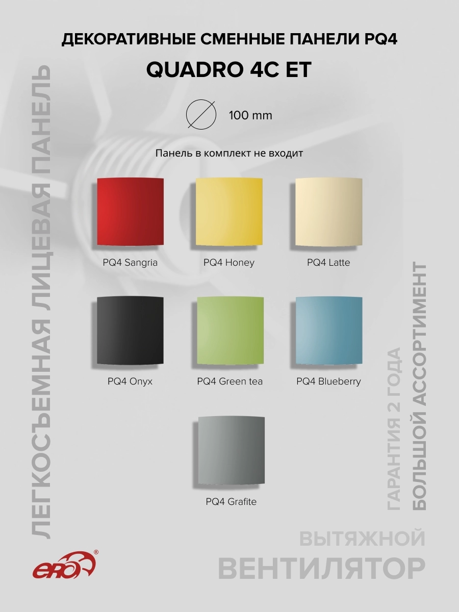 Классическая закрытая лицевая панель легко снимается, что значительно упрощает обслуживание вентилятора. По умолчанию QUADRO поставляется с белой панелью, но вы можете дополнительно приобрести сменную цветную панель PQ. В ассортименте представлено семь оттенков: Green tea, Latte, Sangria, Graphite, Blueberry, Honey и Onyx.