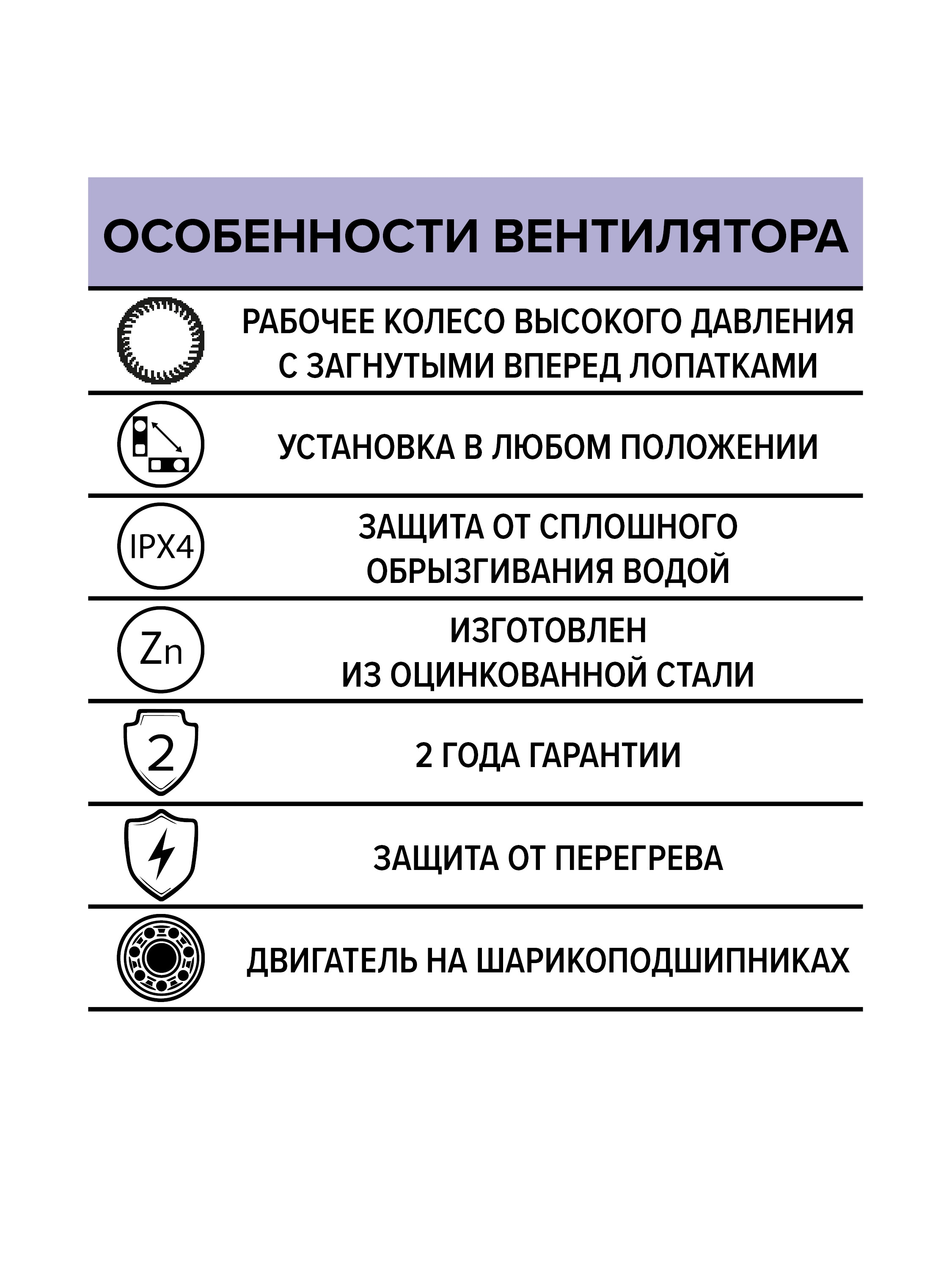 Оборудован рабочим колесом высокого давления с загнутыми вперед лопатками. Оснащается однофазными и трехфазными асинхронными электродвигателями с внешним ротором.
