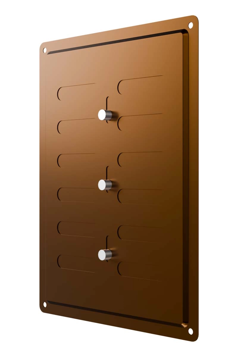 Регулируемая металлическая решетка предназначена для установки в вентиляционный проем, где требуется изменение объема поставляемого воздуха. Решетка изготовлена из стали с полимерным покрытием, устойчива к механическим воздействиям и может размещаться как внутри, так и снаружи помещений. С помощью регулятора на лицевой части решетки возможно изменить объем воздушного потока или полностью перекрыть вентиляционный канал. Регулируемая решетка используется, в том числе, для декоративного оформления вентиляционного отверстия, является элементом интерьера и дополняет общий стиль помещения. Небольшая толщина стали — 0,5 мм — позволяет монтировать решетку практически вровень со стеной, а разнообразие цветов — подобрать оптимальный вариант для любого интерьера. Материал: сталь с полимерным покрытием