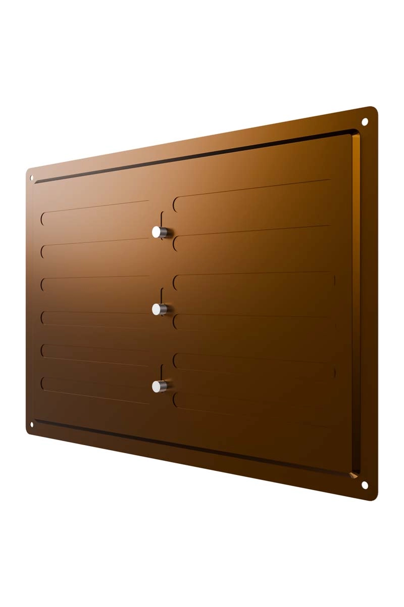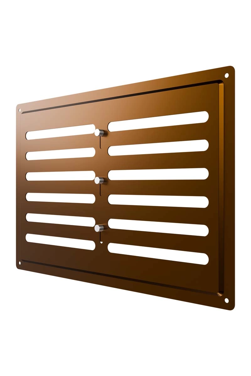 Регулируемая металлическая решетка предназначена для установки в вентиляционный проем, где требуется изменение объема поставляемого воздуха. Решетка изготовлена из стали с полимерным покрытием, устойчива к механическим воздействиям и может размещаться как внутри, так и снаружи помещений. С помощью регулятора на лицевой части решетки возможно изменить объем воздушного потока или полностью перекрыть вентиляционный канал. Регулируемая решетка используется, в том числе, для декоративного оформления вентиляционного отверстия, является элементом интерьера и дополняет общий стиль помещения. Небольшая толщина стали — 0,5 мм — позволяет монтировать решетку практически вровень со стеной, а разнообразие цветов — подобрать оптимальный вариант для любого интерьера. Материал: сталь с полимерным покрытием
