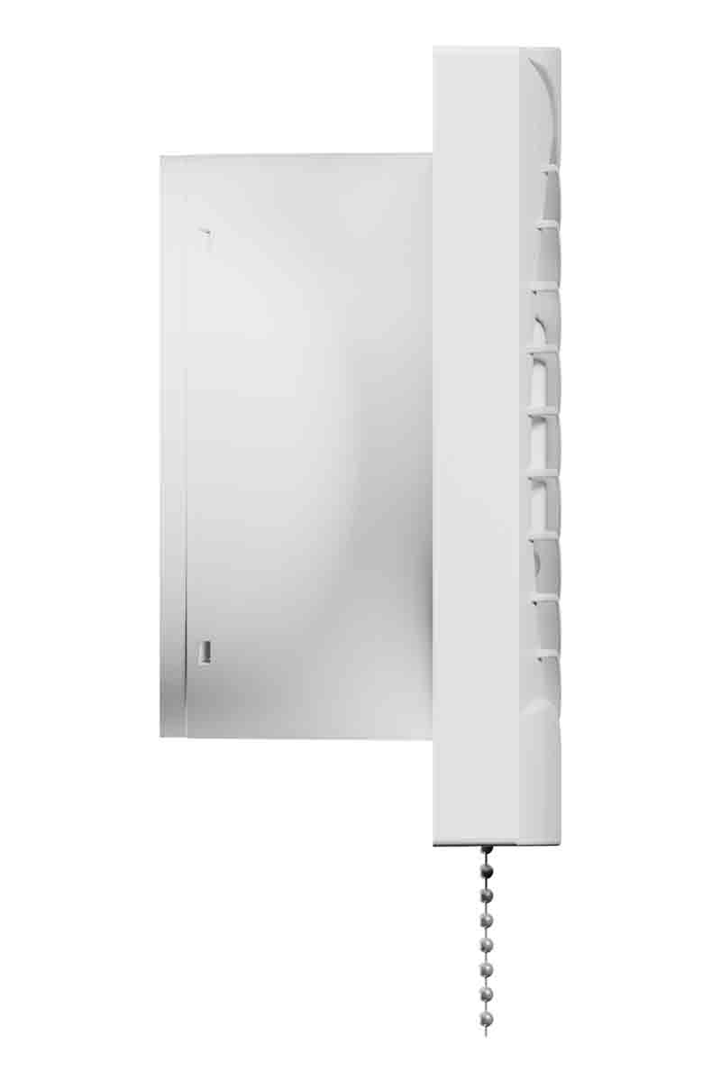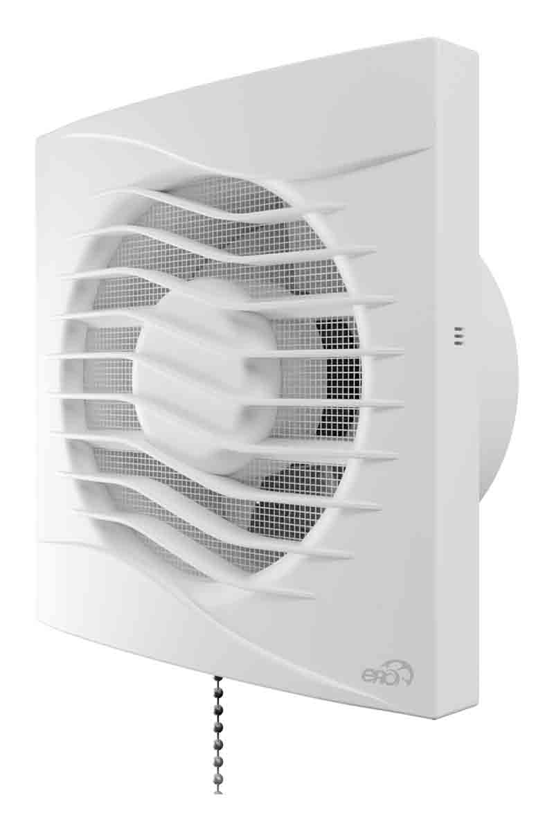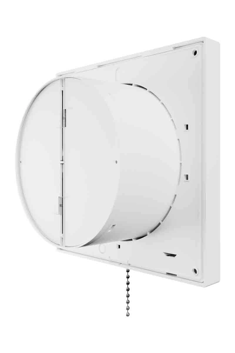 Модель оснащена обратным клапаном с пластиковыми створками и четырьмя защелками, за счет которых клапан надежно фиксируется на фланце вентилятора; тяговым включателем для возможности включения и выключения вентилятора вручную.