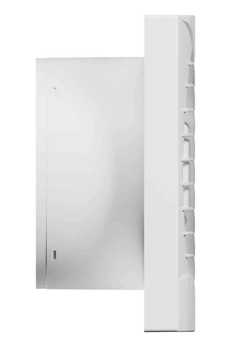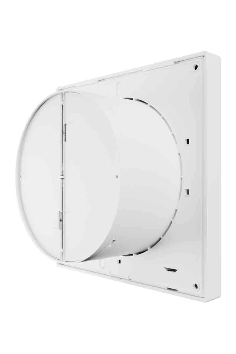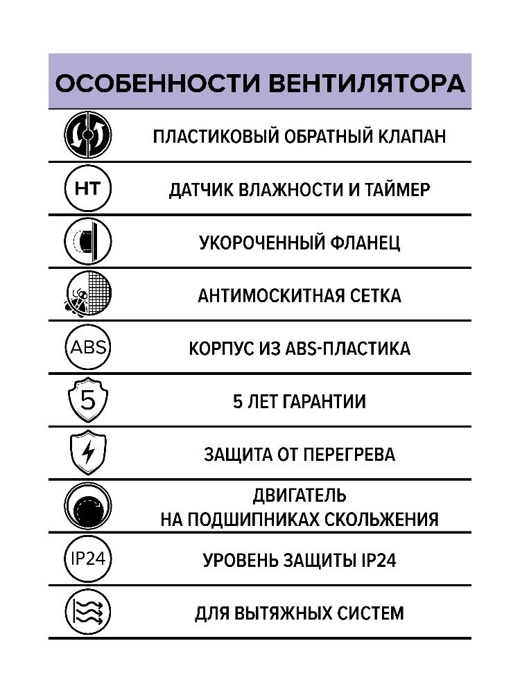 Модель оснащена обратным клапаном с пластиковыми створками и четырьмя защелками, за счет которых клапан надежно фиксируется на фланце вентилятора; платой управления HT с электронным таймером и датчиком влажности. Это позволяет настроить время работы с помощью переключателей. Интервалы работы 5, 15 или 30 минут. По умолчанию после нажатия на выключатель устройство отработает 15 мин. При необходимости можно изменить интервал работы либо отключить таймер. Датчик влажности в типовом режиме включится автоматически, когда зафиксирует влажность свыше 70 % и выключится после ее снижения. Также возможно настроить следующие значения влажности: 50 % или 90 %. Либо отключить встроенный датчик влажности совсем.