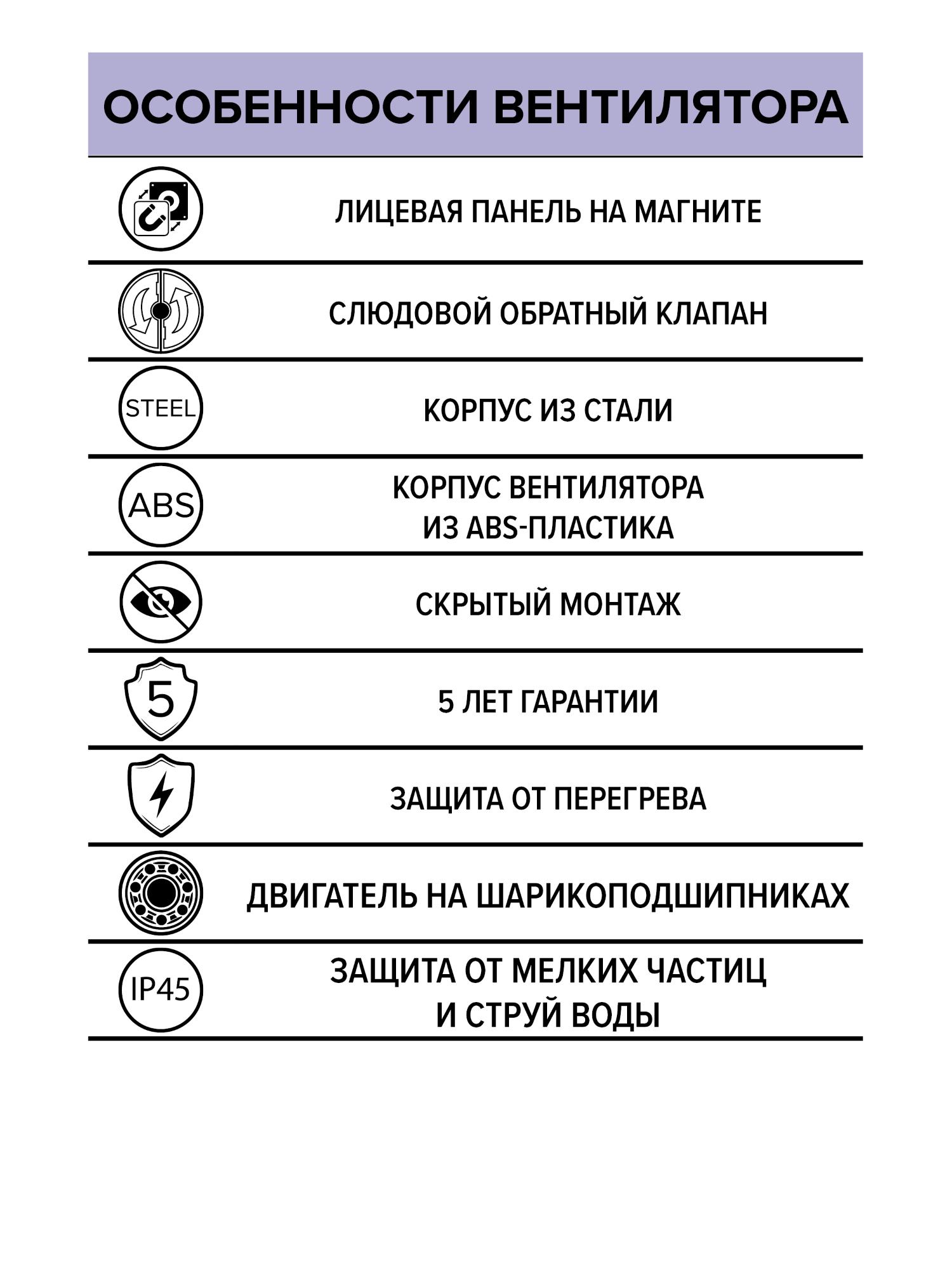 В комплект поставки входят вентилятор, панель под отделку, магнитные фиксаторы с регулировкой, крепежные элементы и инструкция по монтажу.