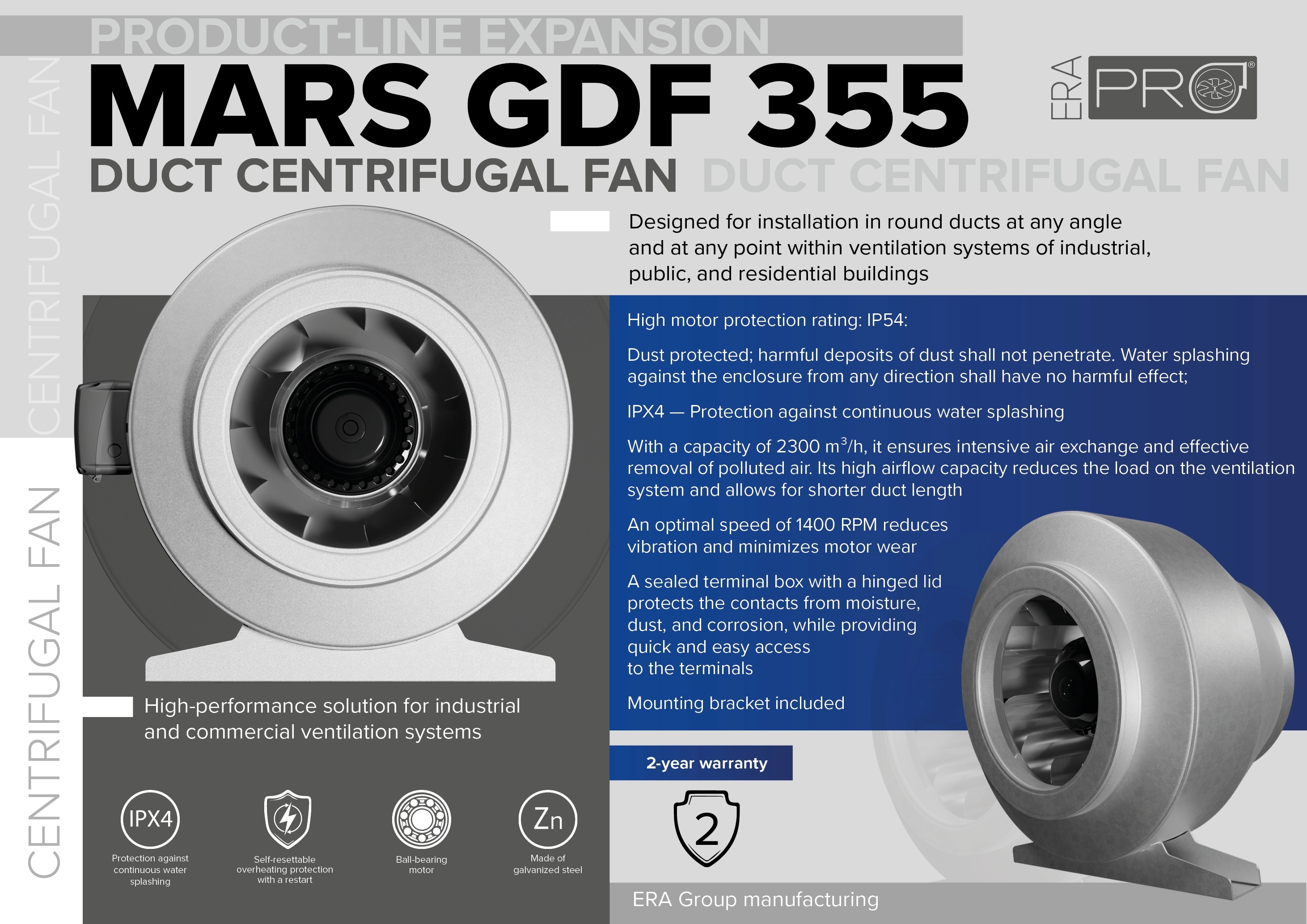 Product-line expansion. MARS GDF 355 Duct centrifugal fanHigh-performance solution for industrial and commercial ventilation systems.