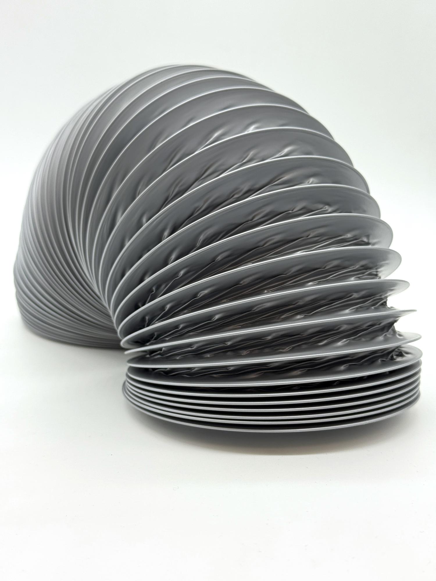 PF flexible reinforced ducts are used in low and medium-pressure air conditioning and ventilation systems. Material: PVC film and steel wire. Thickness: 0.12 mm. Operating temperature: -30 to +100 °C. Available in several colors. Also available in rectangular versions and various colors.