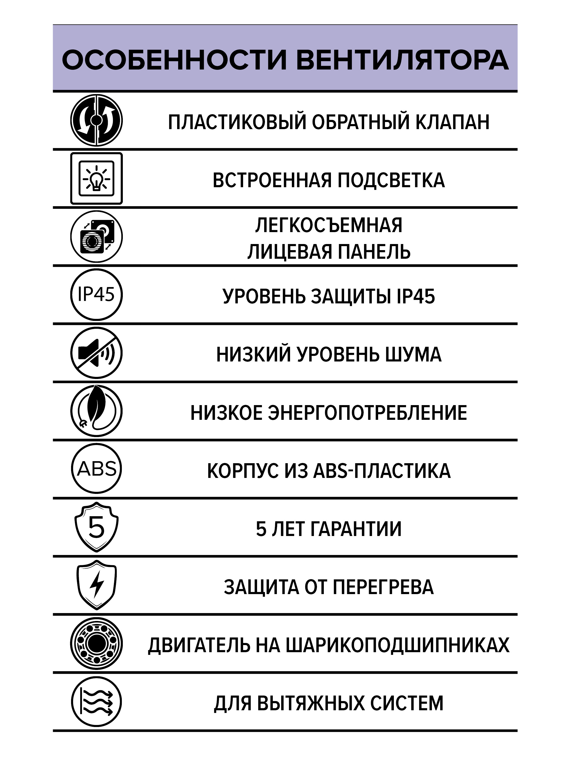 The easily detachable face panel provides quick access to the fan's internal components for cleaning and maintenance. The fan is also equipped with a noiseless back-draught shutter, which prevents unpleasant odors from penetrating from the ventilation shaft.