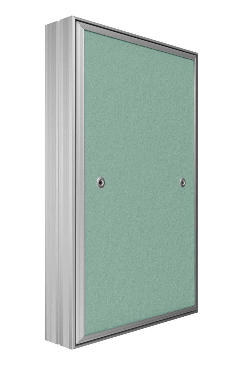 Revision access doors D Ceramo Base with front door opening for tiles are designed for hidden access and maintenance of engineering, plumbing, electrical and other communications. D Ceramo Base are installed in wall and partition niches made of masonry (brick, concrete, foam concrete, etc.) or sheet (plasterboard, etc.) materials. Open and close with a slight press on the door, after closing they are securely fixed in the frame. Revision access doors are made of aluminum profile. Door is filled with moisture-resistant plasterboard. The door is equipped with a pressure lock, a rubber seal, a safety mechanism for safe opening of the door, has the ability to completely remove the door. Maximum opening angle is 180 degrees.