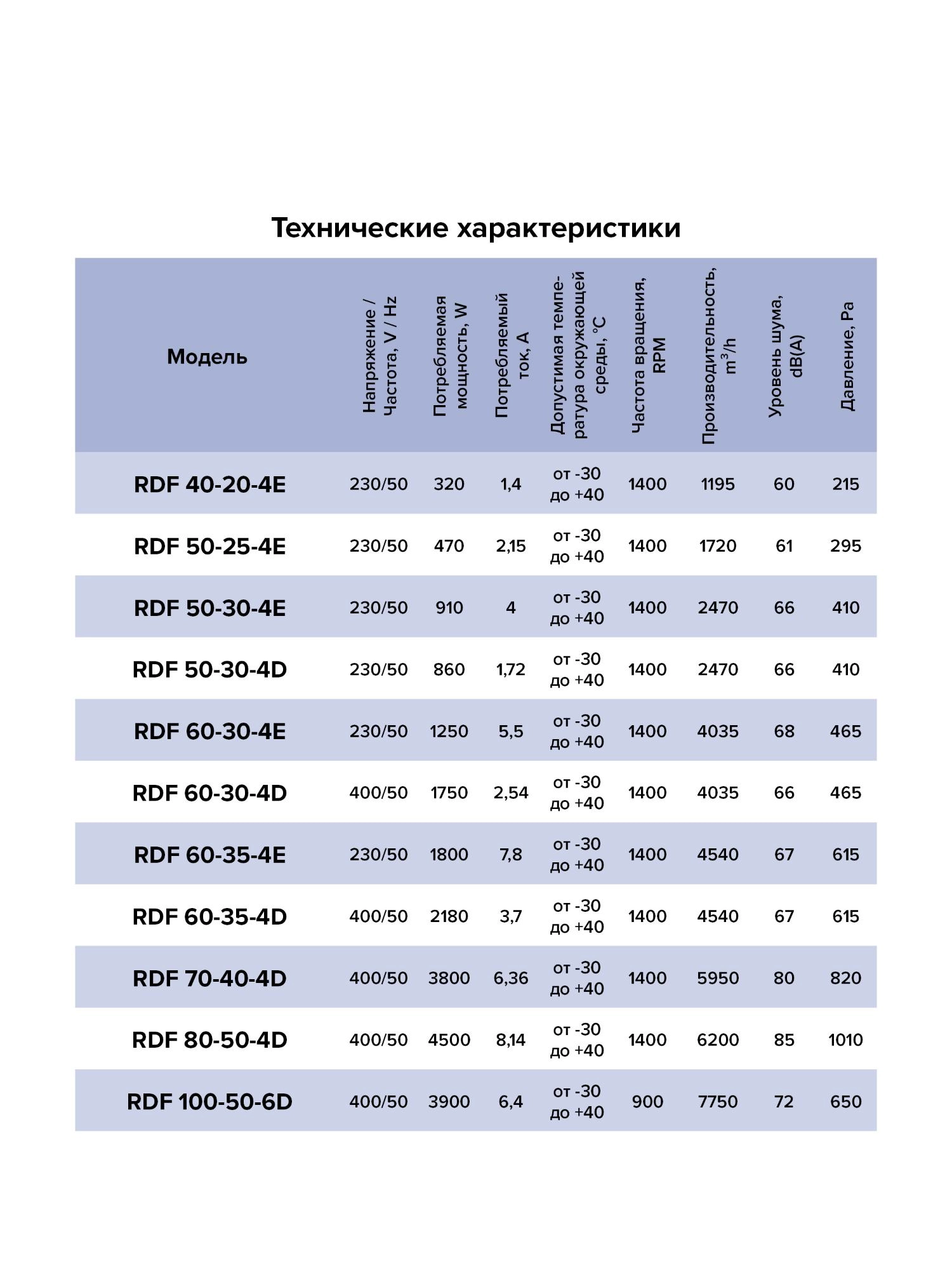 Centrifugal Duct Fan RDF This fan is designed to maintain the specified air velocity within the ventilation ducts of residential and commercial buildings. The fan housing is made of galvanized steel, constructed without contact welding, utilizing a Pittsburgh lock design. It is equipped with a high-pressure impeller featuring forward-curved blades. The fan is available with single-phase and three-phase asynchronous electric motors with an external rotor. The motors are equipped with a reusable bimetallic thermal protection system to prevent overheating. The fan can be installed in any orientation. Service Life: 5 years Performance: Ranges from 1153 to 7250 m³/h