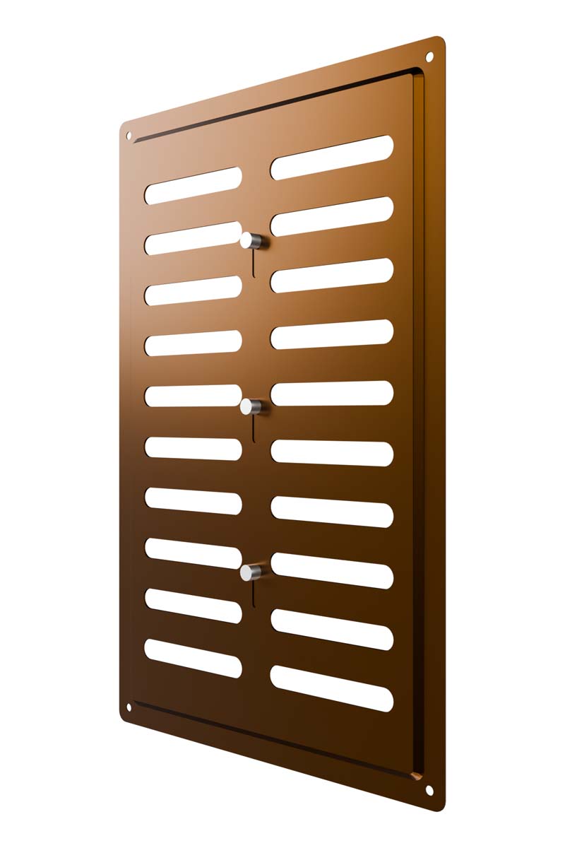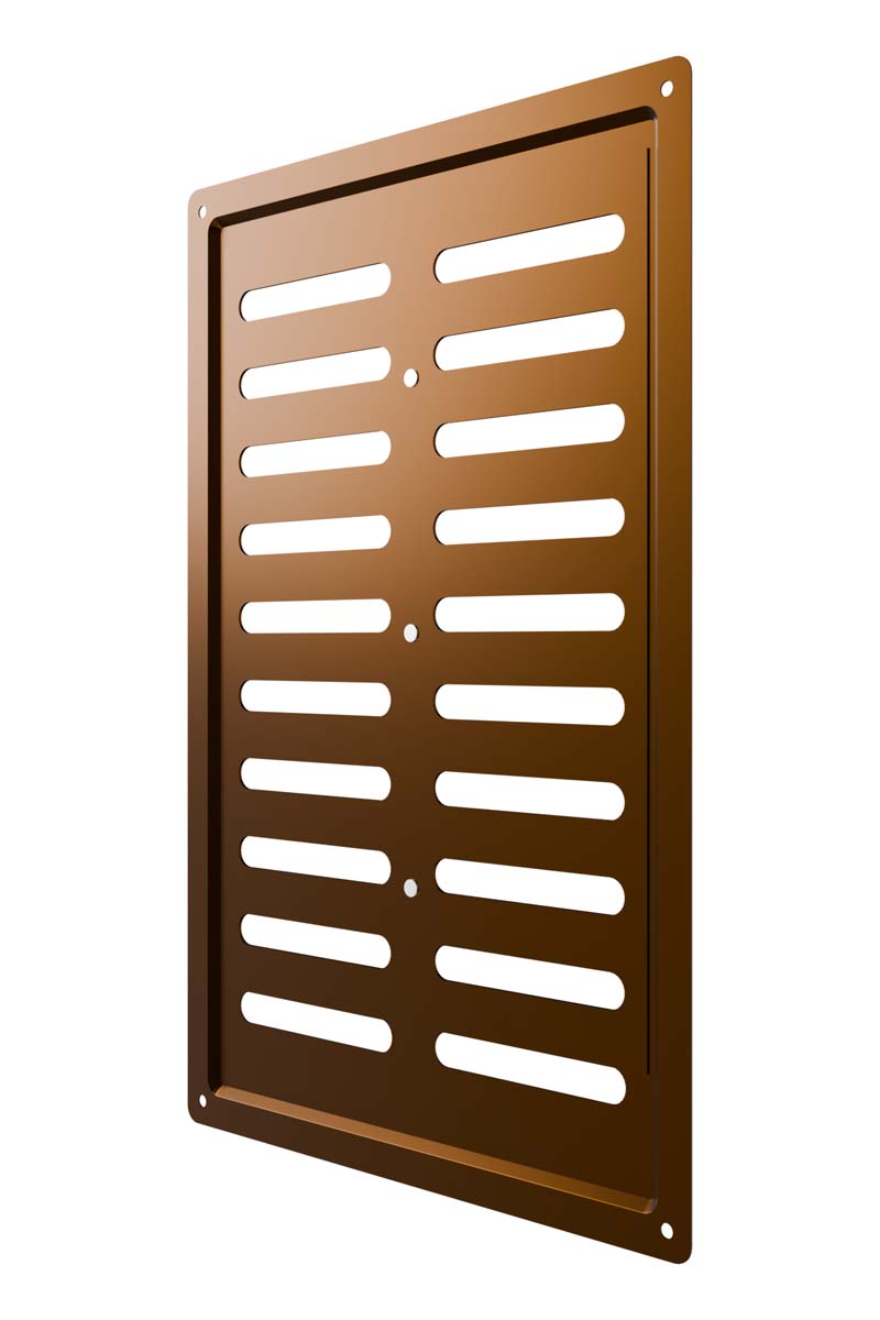 Регулируемая металлическая решетка предназначена для установки в вентиляционный проем, где требуется изменение объема поставляемого воздуха. Решетка изготовлена из стали с полимерным покрытием, устойчива к механическим воздействиям и может размещаться как внутри, так и снаружи помещений. С помощью регулятора на лицевой части решетки возможно изменить объем воздушного потока или полностью перекрыть вентиляционный канал. Регулируемая решетка используется, в том числе, для декоративного оформления вентиляционного отверстия, является элементом интерьера и дополняет общий стиль помещения. Небольшая толщина стали — 0,5 мм — позволяет монтировать решетку практически вровень со стеной, а разнообразие цветов — подобрать оптимальный вариант для любого интерьера. Материал: сталь с полимерным покрытием